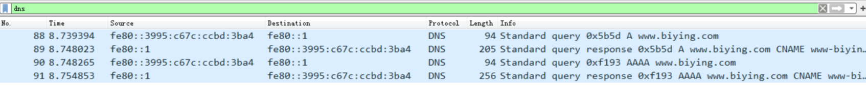可以看到,访问www.biying.com总共产生了四条数据,两次DNS请求,第一次查询www.biying.com域名对应的IPv4地址,第二次查询www.biying.com域名对应的IPv6地址。