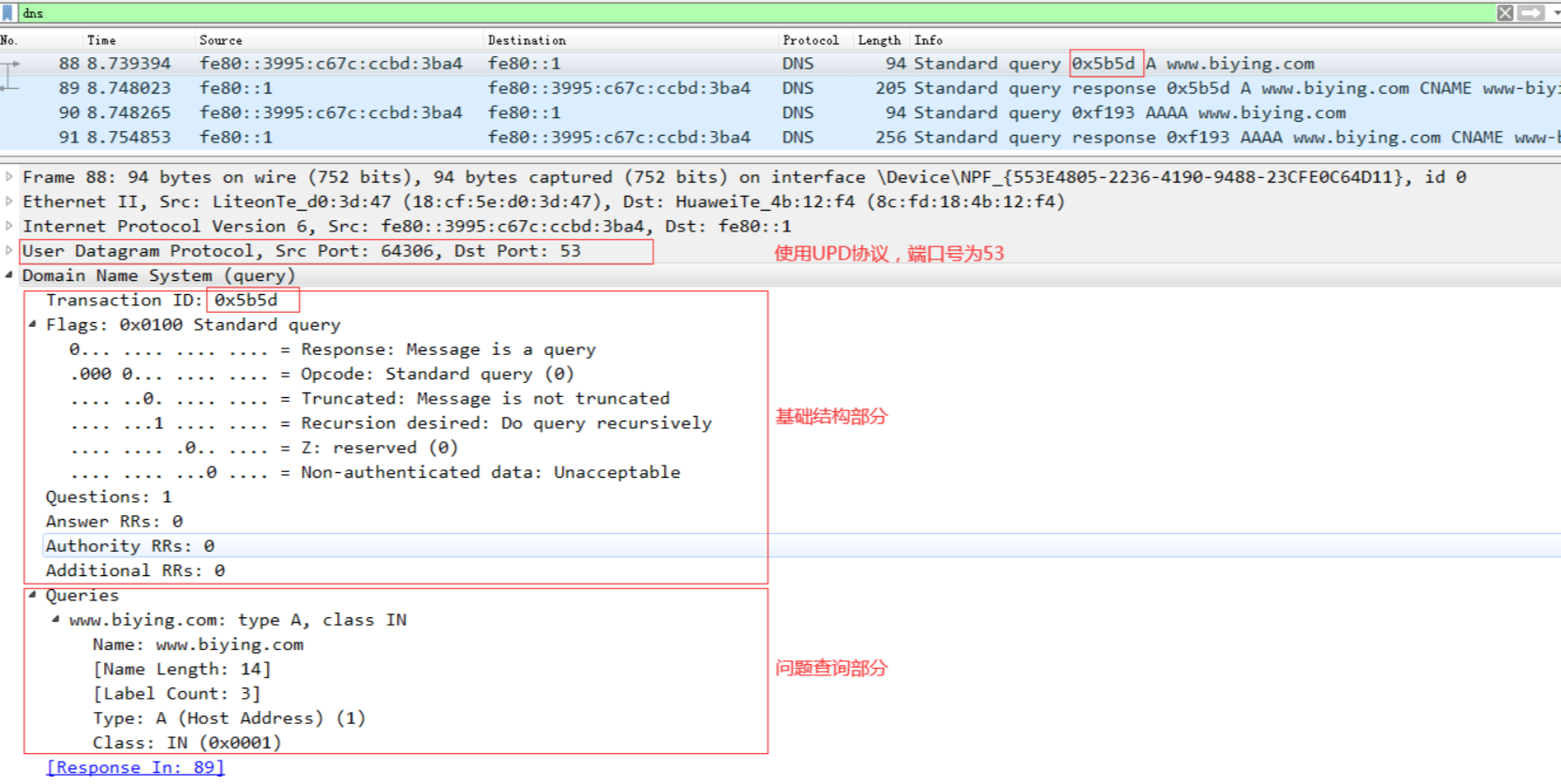 那么,对于上面报文内容,翻译过后的意思就是,“该报文为标准查询(Opcode=0)请求(QR=1)报文,向本地域名服务器请求查询,发起请求内容为’获取www.biying.com'所对应的IPv4地址,期待本地域名服务器递归查询(RD=1)请求。